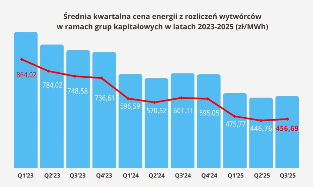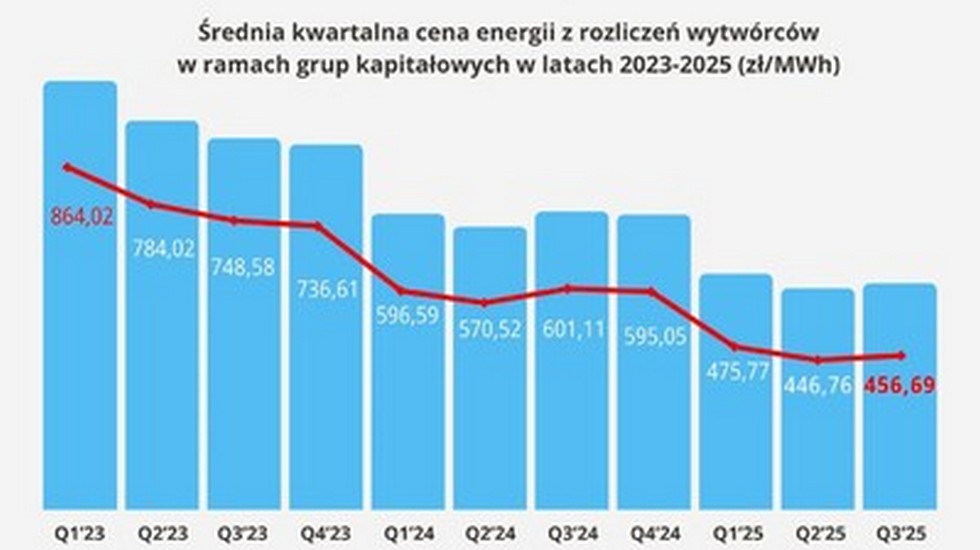 W trzecim kwartale 2025 r. średnia cena energii z rozliczeń wytwórców w grupach kapitałowych wyniosła 456,69 i była o ponad 2% wyższa niż w ubiegłym kwartale (446,76 zł/MWh).