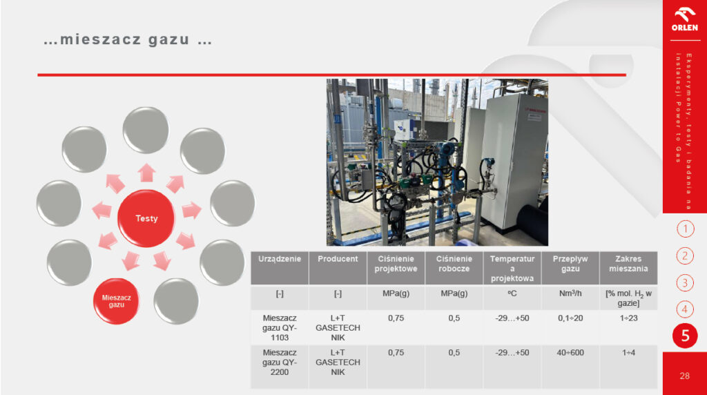 Wodór trafiający do wyspy badawczej trafia do mieszaczy o dwóch różnych zakresach przepływu – 0,1-20 Nm3/h lub 40-600 Nm3/h, gdzie tworzone są mieszanki gazu ziemnego z wodorem w zakresie 1-23%.
