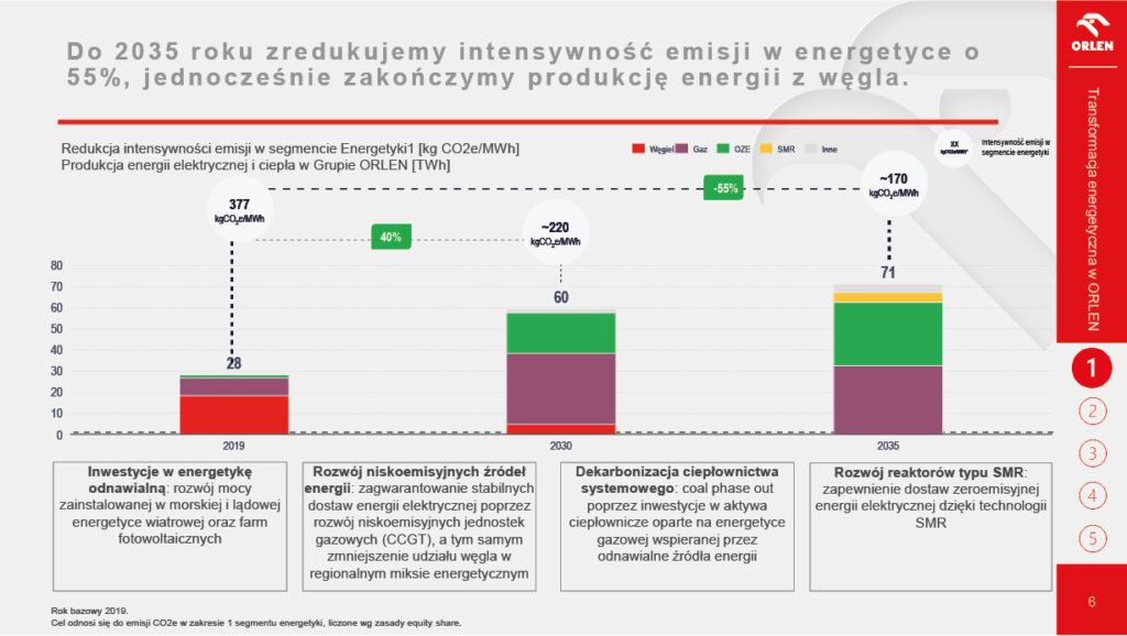 – redukcję intensywności emisji produkcji energii elektrycznej i ciepła, jaką w Strategii do 2035 r. przyjął ORLEN, a która liczona w kilogramach ekwiwalentu emisji dwutlenku węgla ma wynieść 55% – jako bazę przyjmując 2019 r.,