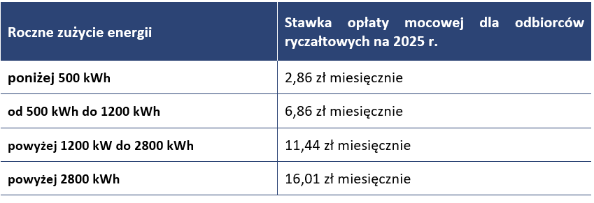 Tab. 2. Wysokość opłaty mocowej na 2025 r. dla odbiorców ryczałtowych, zależna od progu rocznego zużycia energii