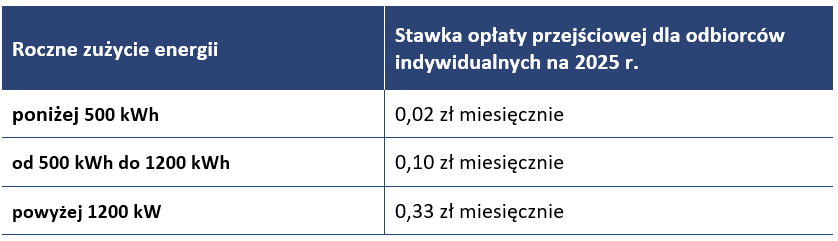 Tab. 3. Wysokość opłaty przejściowej w latach 2019-2025 dla odbiorców indywidualnych, zależna od progu rocznego zużycia energii