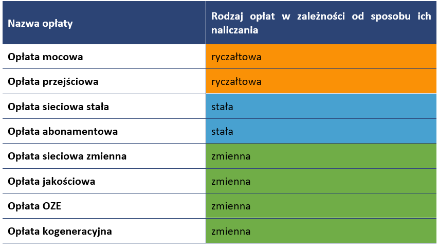 Tab. 1. Rodzaje opłat dla odbiorców w gospodarstwach domowych w części rachunku dotyczącej dystrybucji – klasyfikacja w zależności od sposobu ich naliczania