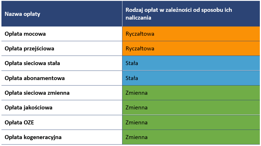 Rodzaje opłat dla odbiorców w gospodarstwach domowych w części rachunku dotyczącej dystrybucji – klasyfikacja w zależności od sposobu ich naliczania