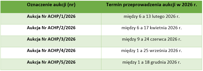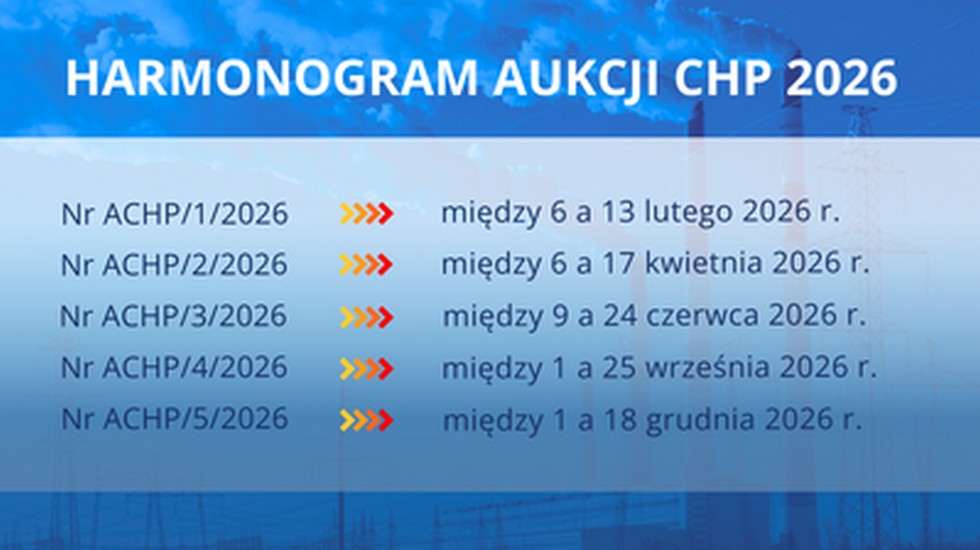 Według harmonogramu ogłoszonego przez Prezesa URE w 2026 r. odbędzie się pięć aukcji CHP, z których pierwsza planowana jest na luty a ostatnia na grudzień przyszłego roku.