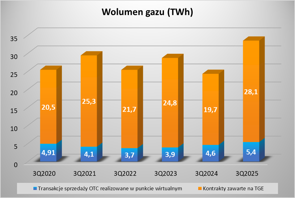 Wolumen sprzedaży gazu ziemnego dla transakcji zrealizowanych w punkcie wirtualnym OTC w trzecim kwartale 2025 r. wyniósł 5,4 TWh, co oznacza wzrost o blisko 0,8 TWh wobec trzeciego kwartału 2024 r. Z kolei wolumen gazu dostarczonego w ramach kontraktów zawartych na TGE wyniósł 28,1 TWh, co oznacza wzrost dostaw aż o 8,4 TWh w stosunku do analogicznego okresu ub. r.