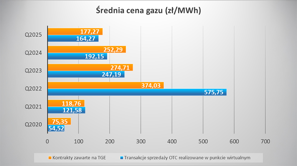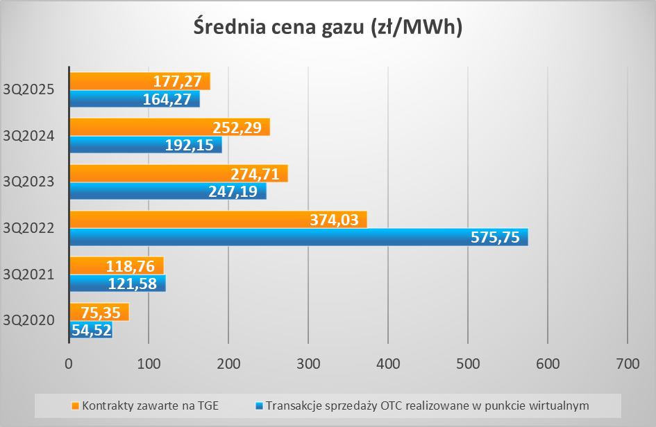Średnia cena gazu dla transakcji zawieranych na TGE w trzecim kwartale 2025 r. wyniosła 177,27 zł/MWh, o blisko 30% mniej niż w analogicznym okresie 2024 r. Natomiast w kontraktach realizowanych w punkcie wirtualnym OTC za gaz płacono średnio 164,27 zł/MWh, co oznacza spadek ceny tego paliwa o 14,5%.