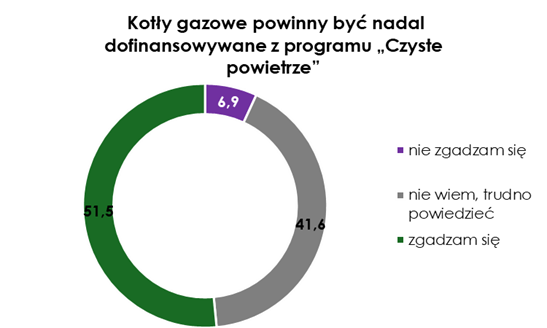 Wielkim rozczarowaniem dla Polaków było wyłączenie kotłów gazowych z programu Czyste Powietrze. 51,5% respondentów uważa, że kotły gazowe powinny być nadal dofinansowywane ze środków publicznych – na wsiach takich wskazań jest jeszcze więcej, aż 54,3%. Tylko 6,9% Polaków popiera wycofanie wsparcia finansowego dla kotłów gazowych.